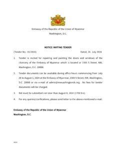 Tender documents can be available during office hours commencing from July 26 to August 1, 2024 at the Embassy of Myanmar, 2300 S Street, NW, Washington, D.C. 20008 or via e-mail of admin@mmrwdc.org . No fees for tender documents will be charged.
